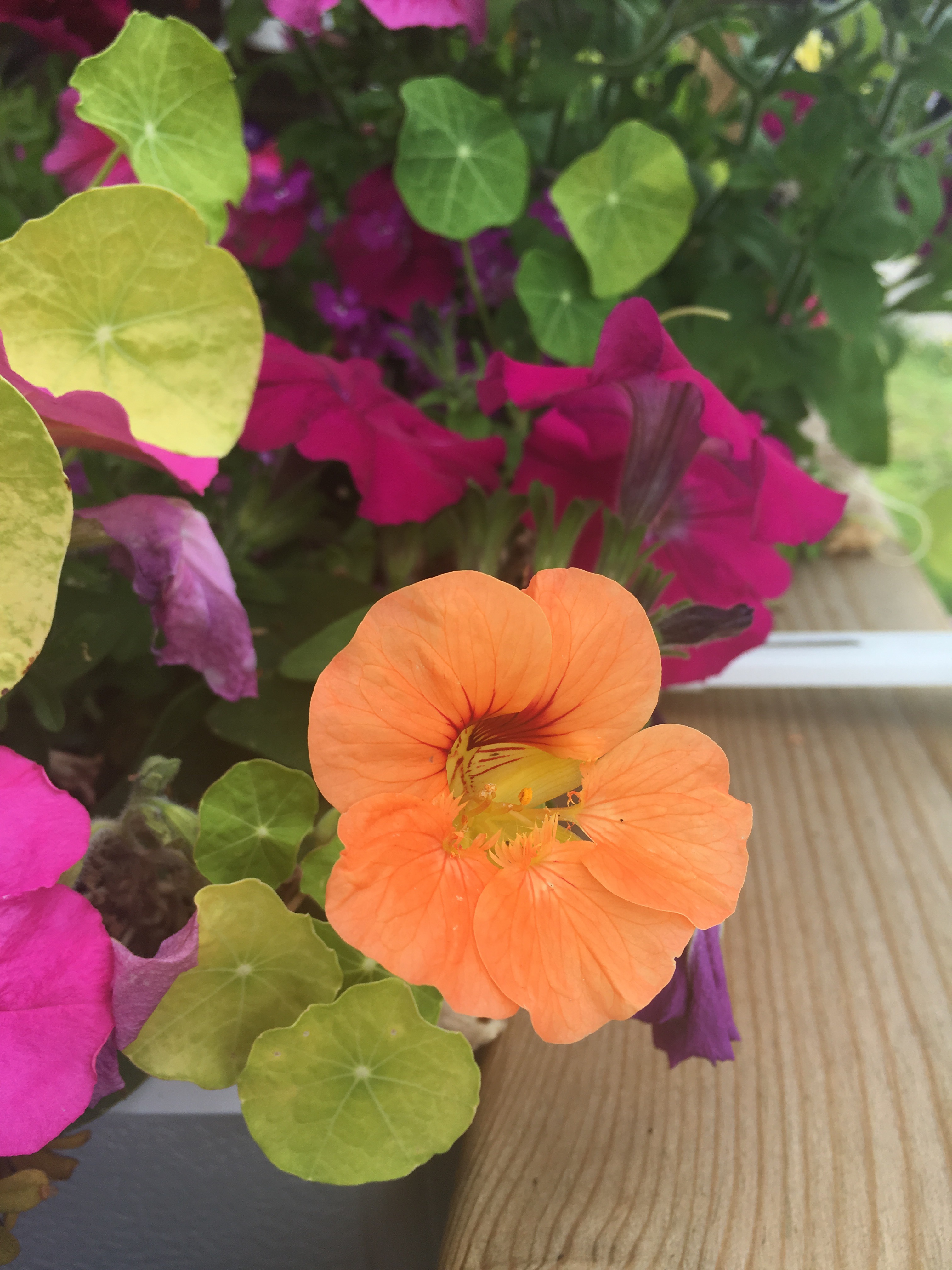 Har i balkonglådorna på verandan lobelia, petunia och frösådd krasse. Lobelian börjar sloka, ska se om jag kan byta ut den mot något eller om jag väntar och gör om hela balkonglådorna till ”höstlådor” så småningom. Ska ta frön från krassen först, så jag får iaf vänta tills den har blommat över och den blommar för fullt än så länge.
