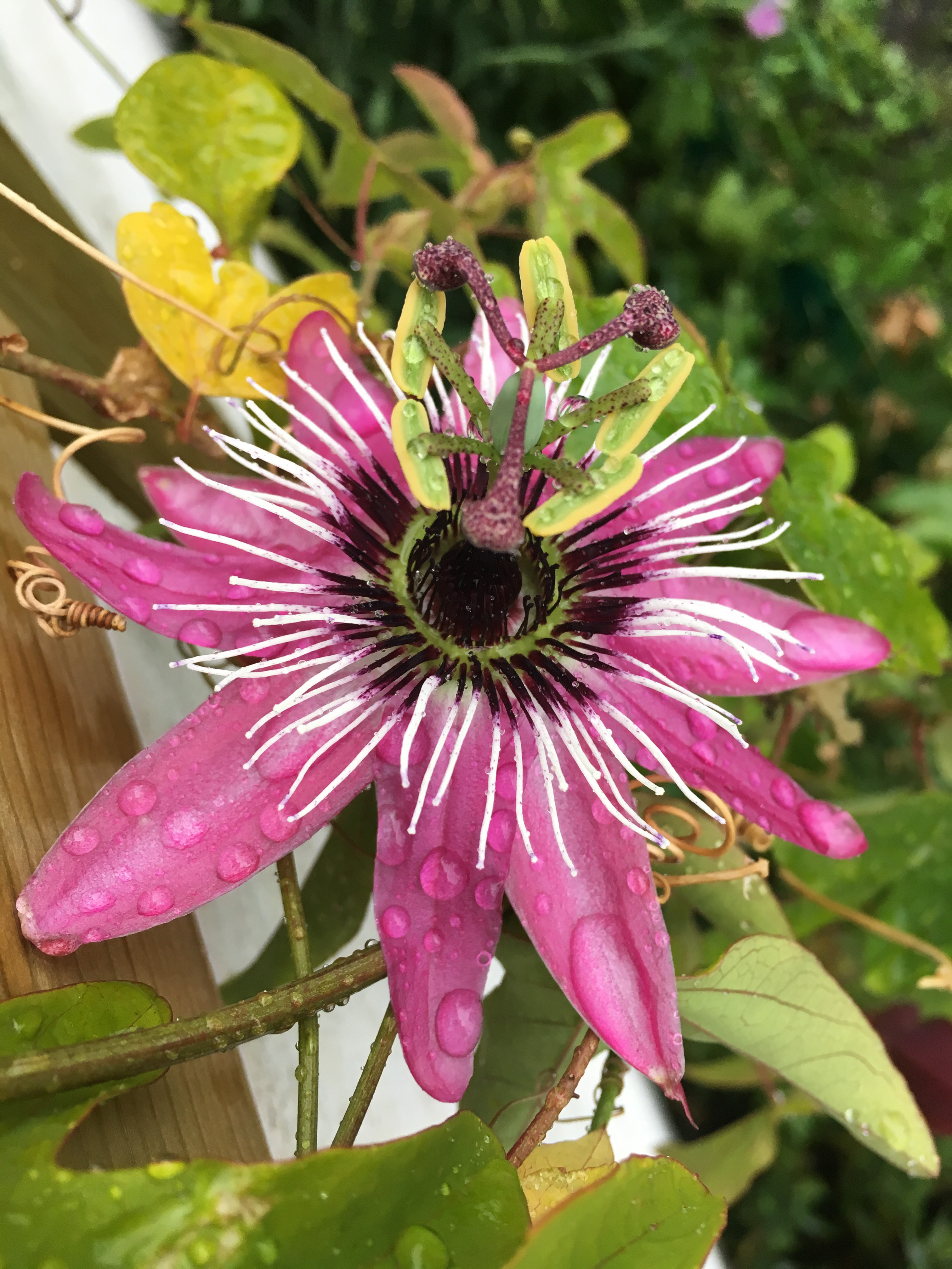Köpte förra året en kruka med tre passionsblommor i en i tre olika färger. De tog sej inte alls förra sommaren och i vintras glömde jag bort krukan i garaget. Tror jag kom ihåg att vattna den en gång. Men den har växt till sej och blommar nu, en färg