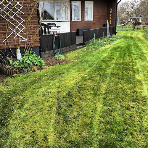 Fick feeling och gav mej på gräsmattan, där gräset snabbt växt sej långt. Fick hjälp av min snorbilliga gräsklippare som jag köpte billigt nånstans förra sommaren, när jag tröttnade på att bråka med robotgräsklipparen. I med lite bensin och lite olja och sen startade den direkt = Bra köp! 🙂 Kunde inte klippa så kort, för det var högt och tungt att köra, får klippa igen snart. Passade också på att gräva ner de tre hortensiorna jag har haft stående ett tag, vi får se om de klarar sej ute. Faktiskt skönt ute, trots att det blåser och det är ju alltid helt ljuvligt det här första i trädgården. Massor av blommor dyker upp och jag planerar vad jag ska plantera i år. Pionerna jag satte förra året har kommit upp. Rosenregnet och rosorna är fortfarande tveksamt om de har klarat sej, vi får se om dom hämtar sej och kommer igen. Farmors kaprifol, som jag fick skott av från syrran, har klarat sej och kommer nu, och flädern från vårt förra hus. Min historia finns i mina växter 🙂