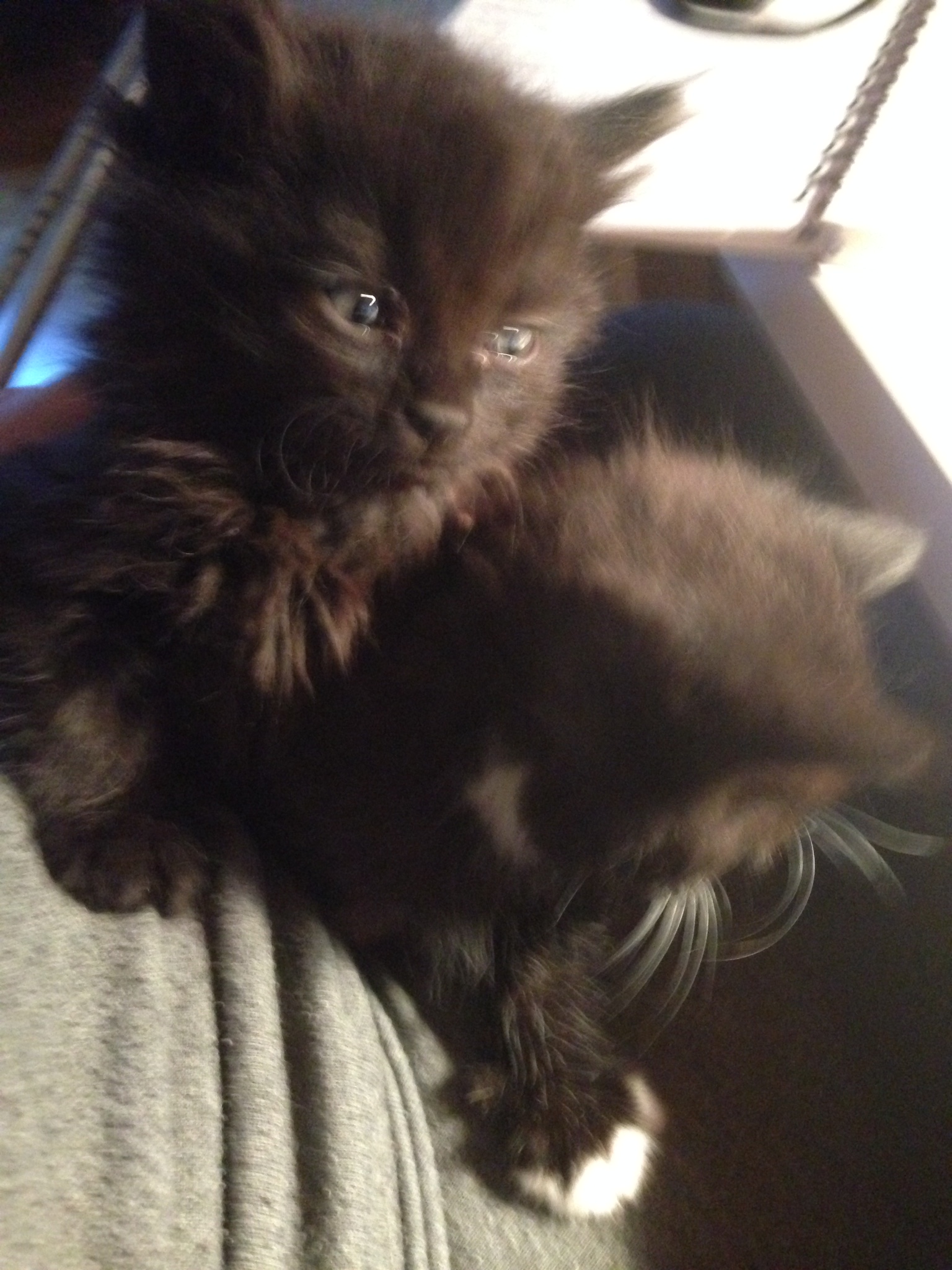 En mysbild på kattungarna också, de är så roliga nu. Och mysiga! 🙂 Den helsvarta lurviga kattungen (Batman, enligt barnen) är så oerhör gosig och sällskaplig och vill helst bara ligga och mysa i ens knä hela tiden (när hon inte ska slåss mot brorsan). Spinner gör hon också, det gör inte X-man (den med vita tassar, enligt barnen) ännu. Världens minsta lilla spinn…. 🙂
